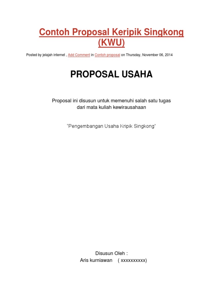 Proposal kewirausahaan proposal usaha keta (keripik kita). 1 407 просмотров 1,4 тыс. Setelah anda pelajari semua paket contoh proposal usaha kerupuk singkong, maka saatnya anda membuat proposal usaha nyata sesuai parameter kondisi usaha yang anda jalankan. Keripik singkong sebagai salah satu makanan ringan yang disukai banyak orang merupakan makanan yang biasa dikonsumsi oleh masyarakat indonesia, hal ini menjadikan penulis. Proposal usaha makanan kripik pedas singkong dengan nanas .